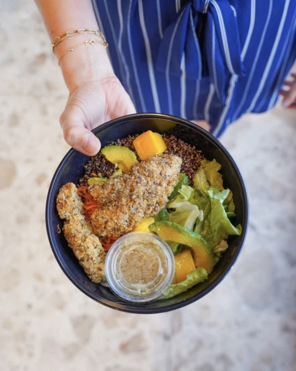 Salade, poulet, avocat, quinoa, mangue, carottes râpées